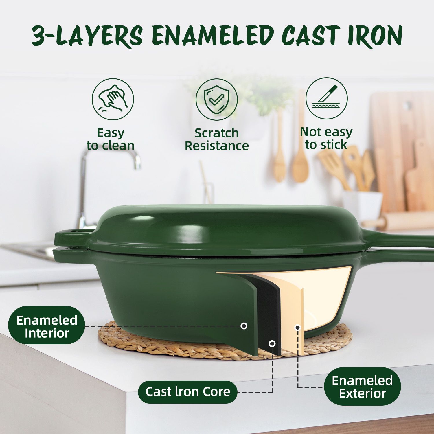 ��ENCLOSED THERMAL CIRCLE: This enamel Dutch oven adopts a circular shower type lid design, with a convex lid design, allowing water vapor to circulate in the pot, locking in the nutrients and moisture of the food, evenly falling on the food, maintaining the original nutrients, and having good thermal insulation performance.