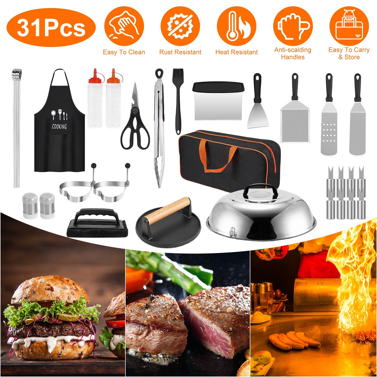 31Pcs Griddle Accessories Kit Flat Top Grill Accessories For Camp Chef with Spatulas Griddle Press Basting Cover Spice Shakers Vegetable Forks Steel S