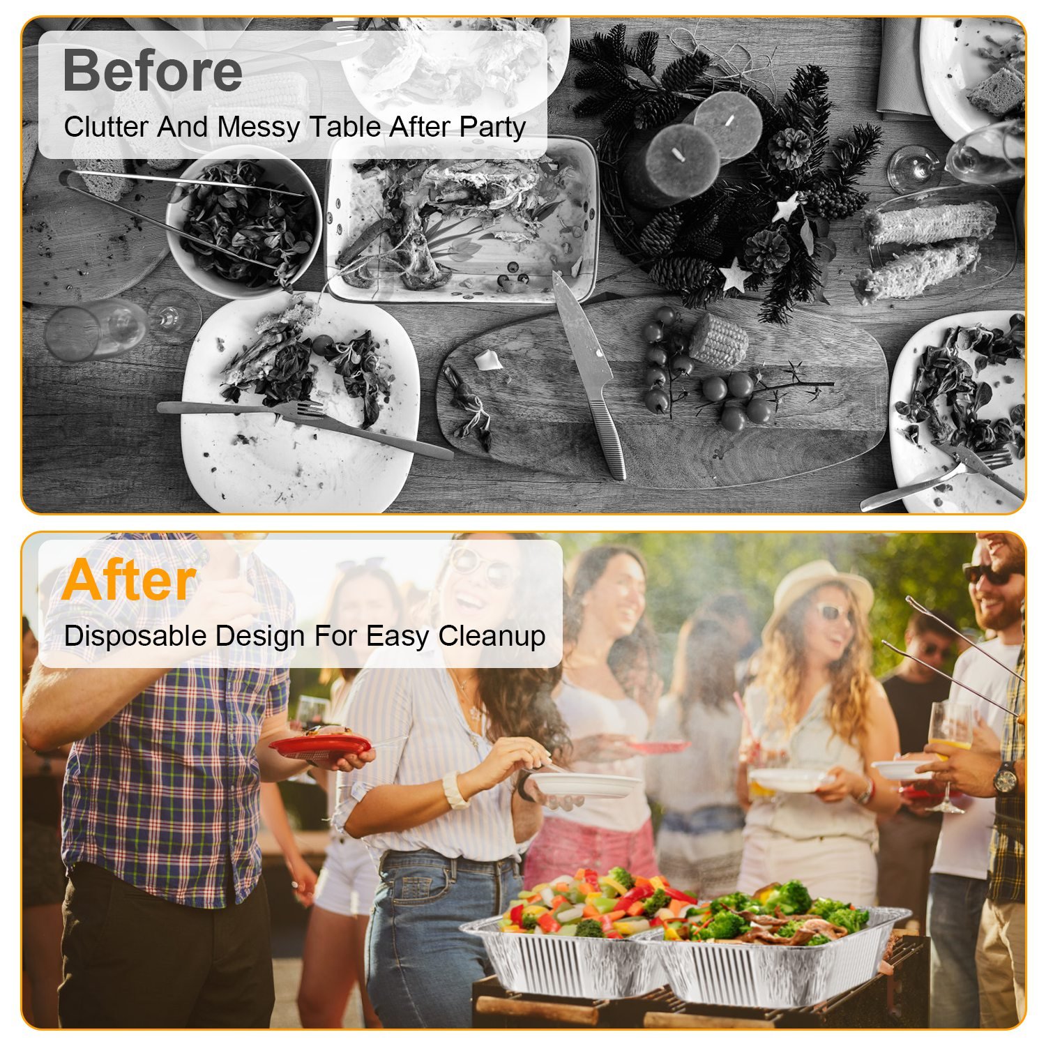 Our 36-piece disposable chafing dish set is the perfect solution for creating an impressive buffet party experience. The comprehensive set includes 6 pans, 6 lids, 6 stands, and a complete set of utensils, everything you need for catering. Made of premium food-grade aluminum foil paper, the pans and lids are non-toxic, ensuring quality and safety for your guests. The sturdy plastic utensils effortlessly handle various kinds of foods. Cleaning up after a lively party can be hassle-free with our disposable chafing dish buffet set\'s easy setup and efficient design, saving you valuable time to fully enjoy gathering with loved ones.