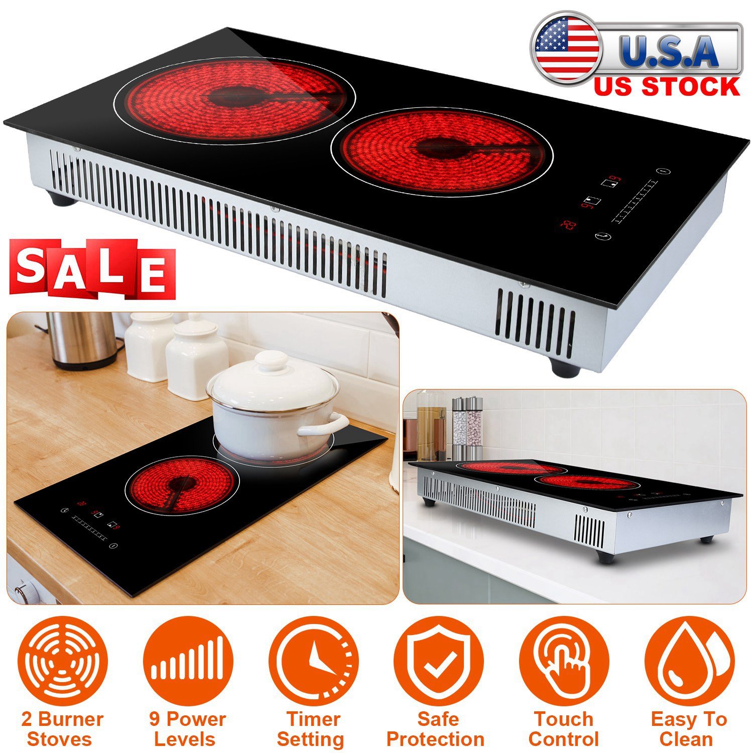 Dual Induction Burners Electric Cooktop 110V Total 1900W Electric Stove Built-in Electric Ceramic Stove with Timer Setting 9 Firepower Levels Over Hea