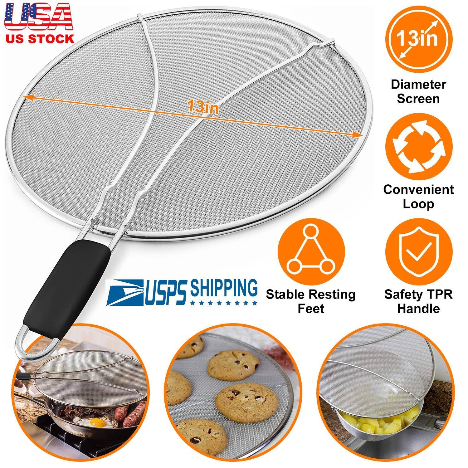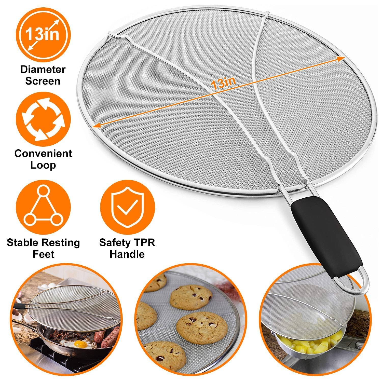 Our Splatter Screen can be used as a fine mesh strainer, steamer, a cooling rack and also used as a splatter screen guard to prevent dangerous hot cooking oil, grease, boiling water and food particles from splashing and splattering. With a suitable TPR 5.9in-handle, you can easily cover your frying pan. It works great for woks, cast-iron skillets, pots, pans, & bowls up to 13in in diameter when fry bacon, chicken, and so on.