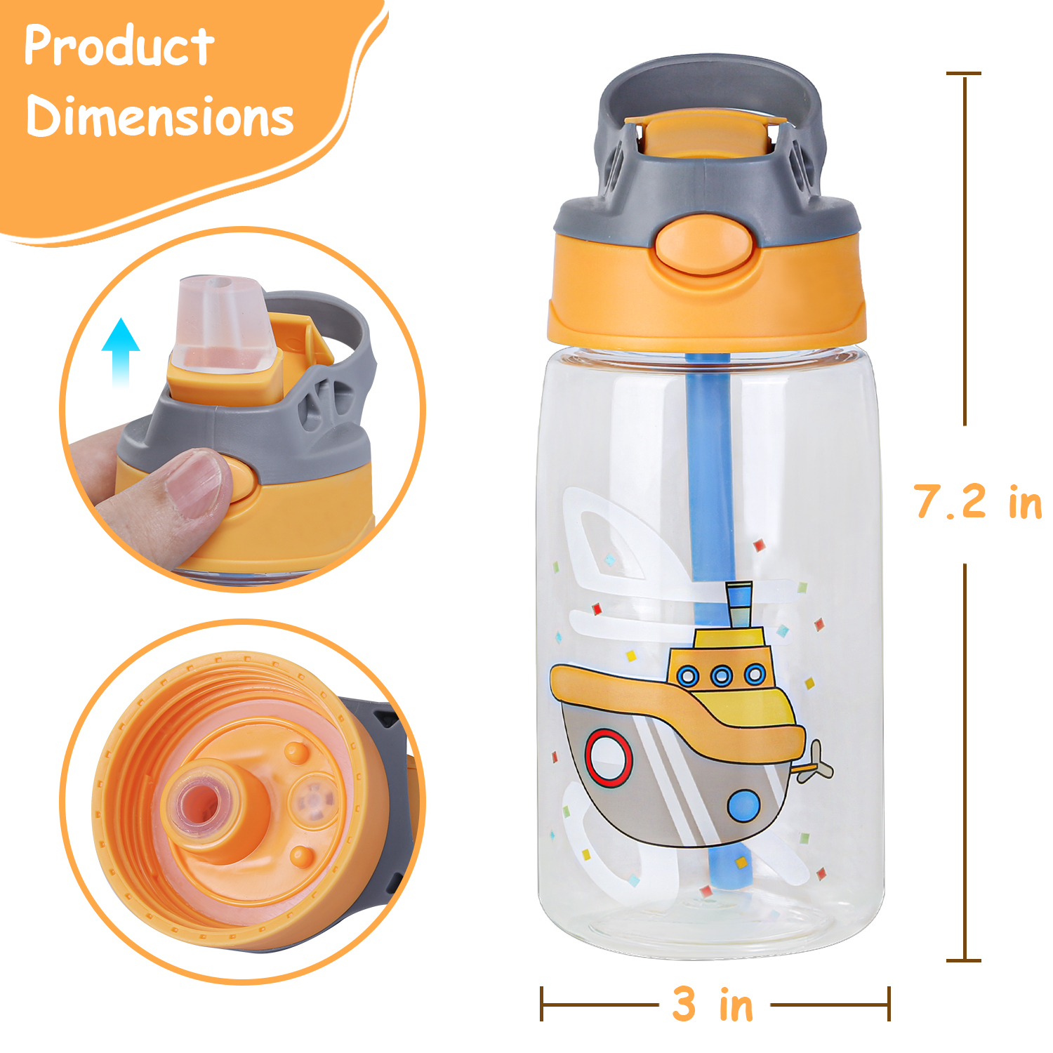16.2Oz Leak-proof Kids Water Bottle with Straw Push Button Sport Water Bottle for Kids Crab Ship Jellyfish Rocket