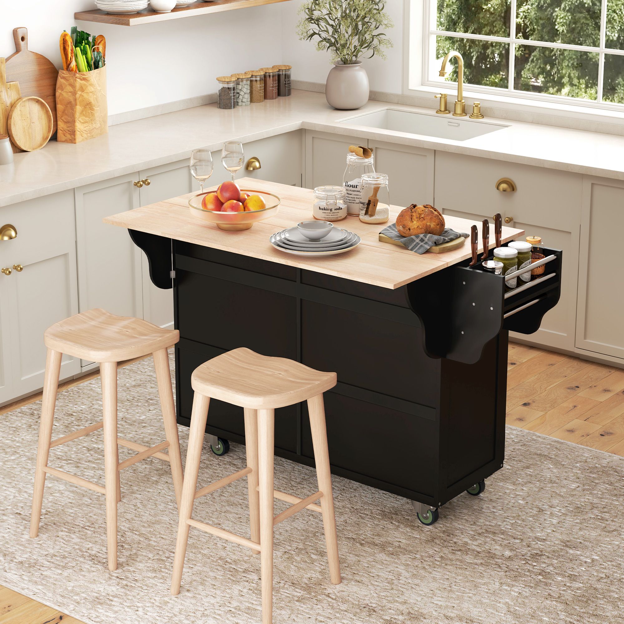 2.- Expandable Workspace: The rubberwood drop leaf countertop easily folds for space-saving or expands for additional dining spot or counter space with your bar stools, offering a water and scratch-resistant surface for your cooking needs.