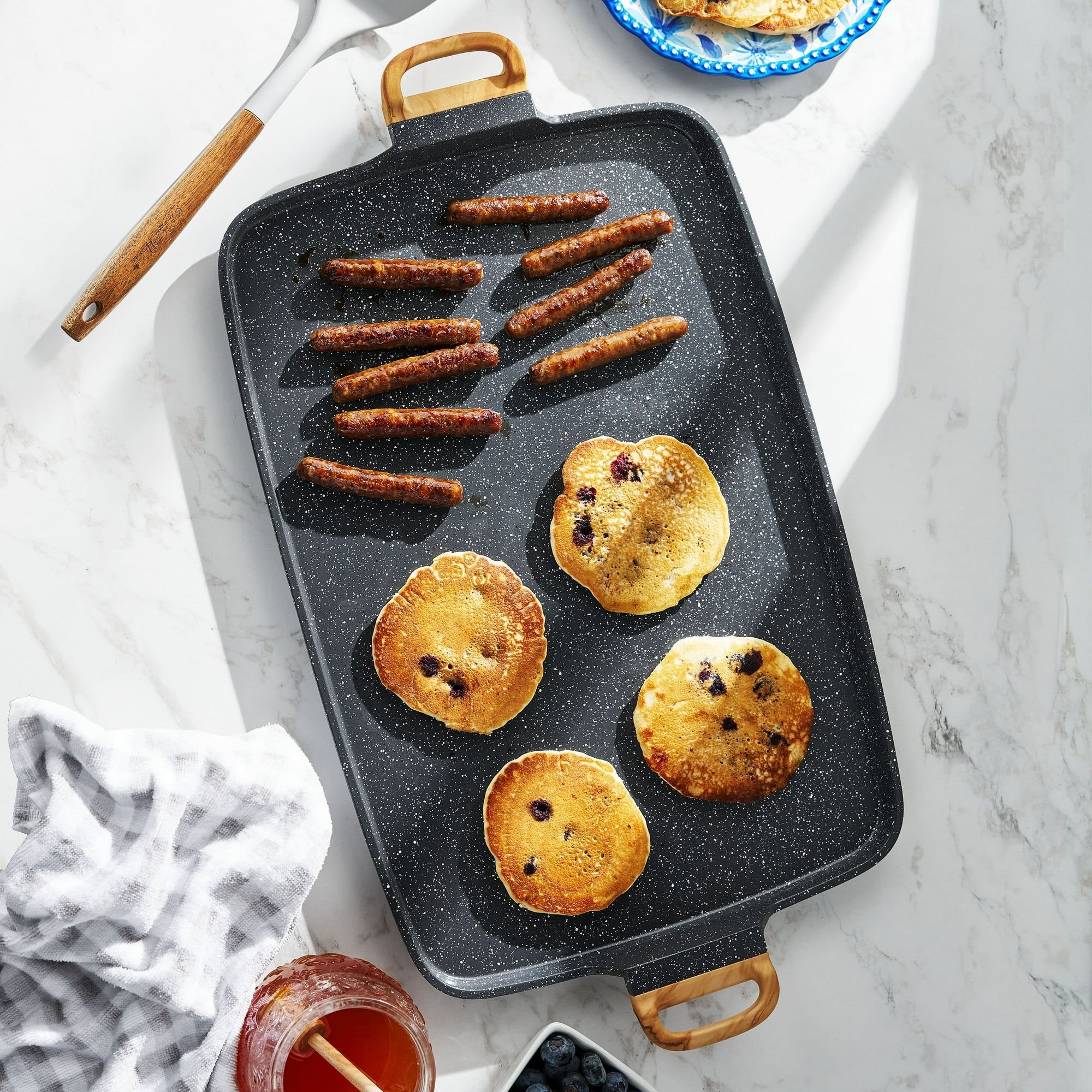 Non-Stick Coating: Features a non-stick coating for simplified cooking and easy cleaning.Rapid Heating: Ensures quick heating and cooling with its rapid and even heat distribution.Vintage Aesthetic: Decorated with a vintage-inspired all-over speckle, adding a stylish touch to your kitchen.Generous Size: Measures 12" x 18", providing ample cooking space for meals.Versatile Use: Suitable for all cooking surfaces except induction and can be used over two burners.Oven Safe: Safe to use in the oven up to 350F for up to 30 minutes.Dishwasher Safe: Easy to clean as it is dishwasher safe.