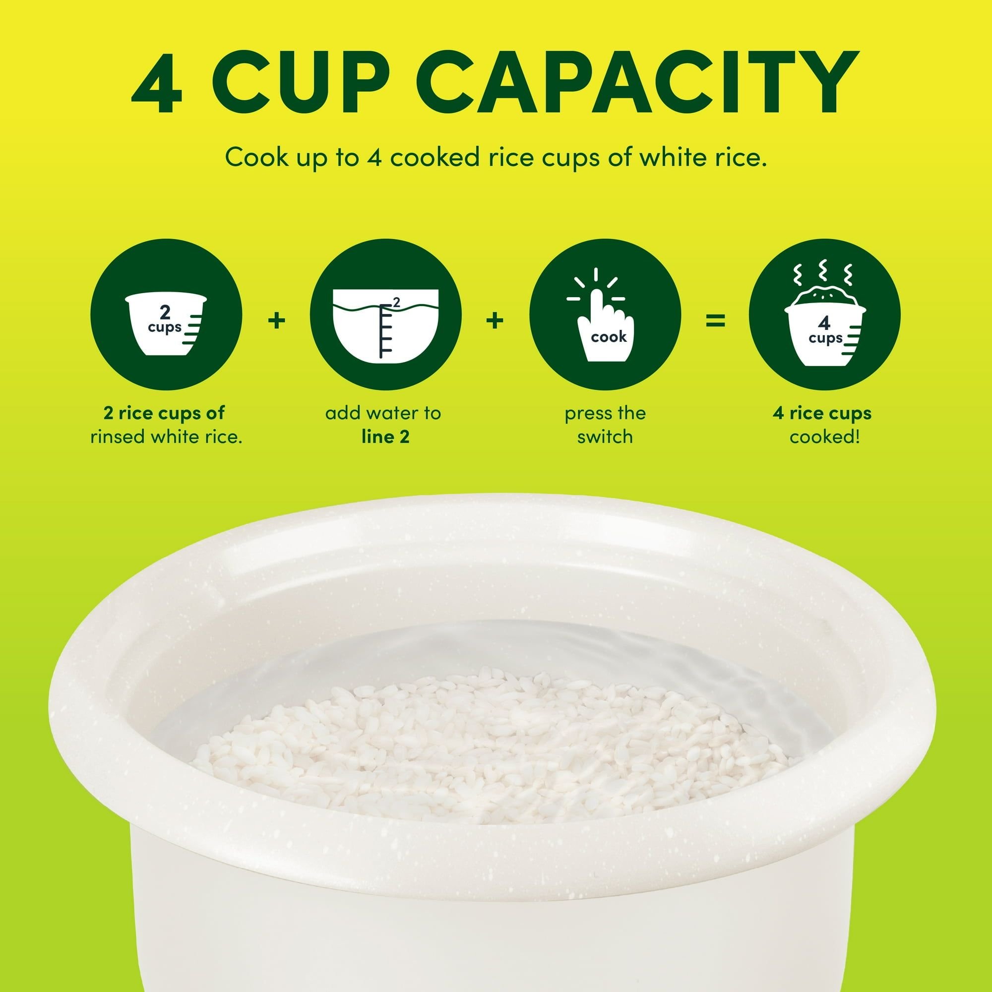 Cooking Capacity: Prepares up to 4 cups of cooked rice or perfect grains, equivalent to 2 cups of uncooked rice.